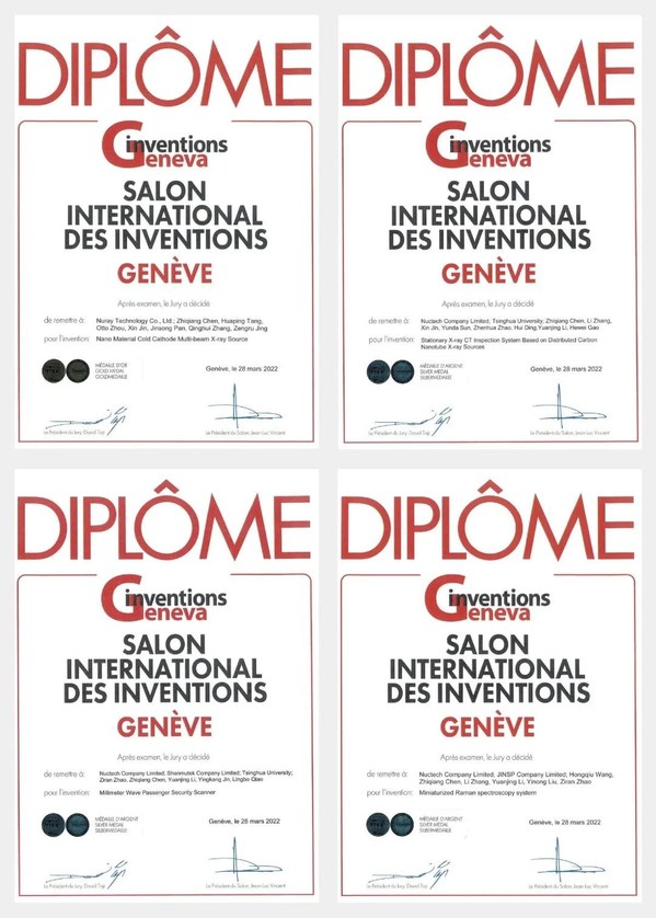 日内瓦国际发明展创办于1973年,由瑞士联邦政府、日内瓦州政府、日内瓦市政府、世界知识产权组织共同举办,是全球举办历史最长,规模最大的发明展之一。受疫情影响,今年多个国家地区的发明以线上方式参展。2022年3月16日至20日,国际专家团队对来自40多个国家和地区的数千项发明进行审核,经过专家评审等多个环节,同方威视碳纳米管冷阴极分布式X射线源、基于碳纳米管分布式X射线源的安检静态CT智能查验系统、毫米波人体安全检查仪、小型化拉曼光谱系统等核心技术成果从中脱颖而出。