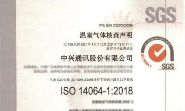深圳2022年4月22日 /新闻稿网 - Xinwengao.com/ — 近日,国际公认的测试、检验和认证机构SGS为中兴通讯颁发ISO 14064-1:2018温室气体(Greenhouse Gas,简称GHG)排放核查声明证书。中兴通讯获得SGS认证证书,表明其温室气体排放量符合国际标准,也成为我国通信行业率先导入并推行ISO14064-1:2018的企业。