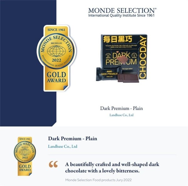 每日黑巧今年首次参选即荣获Monde Selection世界品质评鉴大会颁发的3项品质金奖,表明其致力于为消费者提供优质产品的承诺。Monde Selection总裁Dimitri Delloye先生说:"祝贺Landbase Co., Ltd(每日黑巧所属公司)取得的非凡成就,获得此项大奖表明获奖产品的质量已经能符合评审团严苛的评鉴标准。"