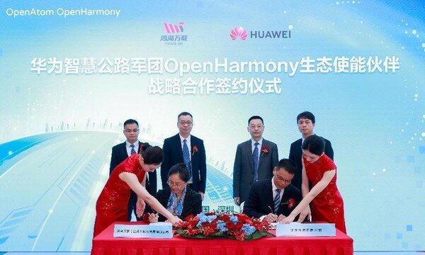 北京2022年6月14日 /新闻稿网 - Xinwengao.com/ — 6月10日,首个面向交通领域的OpenHarmony战略合作在深圳举办。软通动力旗下子公司鸿湖万联(江苏)科技发展有限公司(以下简称”鸿湖万联“)与华为技术有限公司(以下简称“华为”)举行战略合作协议签约仪式。本次签约代表着鸿湖万联与华为智慧公路军团战略合作新篇章,双方将基于OpenHarmony交通发行版的生态相关产品与解决方案建设,共建行业新业态,加快行业数字化转型升级。华为智慧公路军团CEO马悦、合作伙伴发展与销售部部长沈素荣、华为终端BG OpenHarmony使能部部长柳晓见,软通动力董事黄颖、鸿湖万联总经理秦张波,共同见证了签约仪式。
