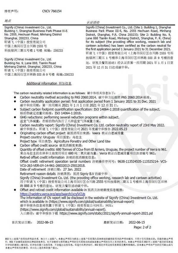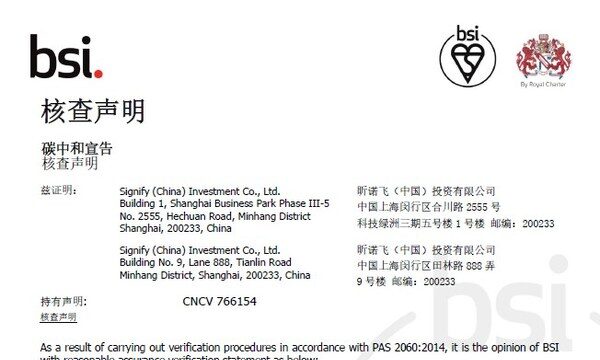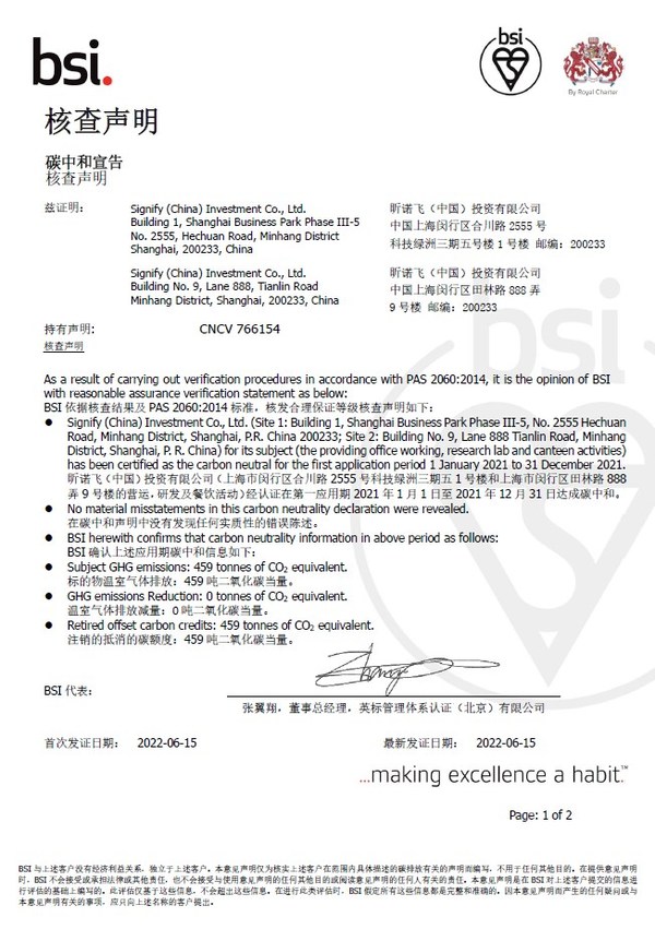 BSI成立于1901年,是全球首个国家标准机构,也是国际标准化组织(ISO)的创始成员之一,负责发起全球多领域常用管理系统标准。由BSI发布的全球第一份碳中和验证标准PAS 2060明确规定了组织、产品和活动量化、减少和抵消温室气体排放的要求,增强了企业碳中和宣言的公信力,是迄今国际上最广泛认可的碳中和声明规范。经该标准核查,昕诺飞(中国)投资有限公司通过优化温室气体减量方案和采购碳抵消额度,抵消了各类营运活动所产生的459吨二氧化碳当量,达成2021年度碳中和目标。
