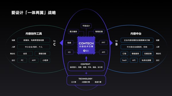 爱设计坚持"一体两翼"的产品战略,"一体"是指以内容资源和云计算为底层的技术支撑,结合平面、图文、视频、H5 、PPT等内容格式在线编辑为一体的「内容技术引擎」。