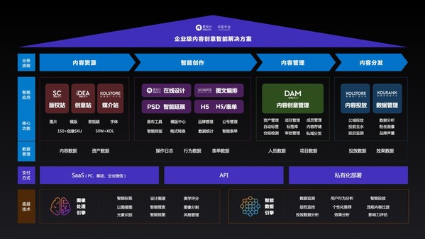 在内容中台的产品封装上,爱设计也取得了实际的商业进展,全面打通内容流转全链路,从资源采买(版权交易平台/创意供给平台)到智能创意(爱设计智能在线设计/365智能图文编辑器/H5/AI智能延展)到内容管理(设计协作iSHEJI Pro/内容管理DAM)到内容分发(KolStore)再到数据管理(KolRank)的智能应用组合,实现平台化、数字化的企业内容全链路解决方案,真正助力品牌实现对用户全生命周期的体验式营销。