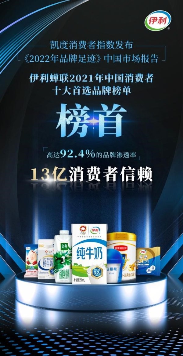 呼和浩特2022年6月24日 /新闻稿网 - Xinwengao.com/ — 消费者的普遍满意是对健康食品企业最大的肯定。6月23日,凯度消费者指数发布《2022年品牌足迹》中国市场报告,伊利凭借92.4%的品牌渗透率、13亿的消费者触及数,蝉联"消费者选择最多品牌"榜首。同时,凯度消费者指数连续10年对26000个全球品牌的洞察结果显示,伊利稳居中国消费者"首选品牌"。 2022年是凯度消费者指数全球品牌足迹报告发布十周年,以真实的消费者行为指标的消费者触及数(CRP),揭示各市场消费者选择最多、最经常购买的品牌。作为健康领域的龙头企业,伊利始终坚持"以消费者为中心",汇聚全球优质资源,持续为消费者提供高品质的产品和服务,深受消费者的青睐和支持,在过去的一年里继续扩大领先优势,强势领跑中国快消品市场。 在伊利,"以消费者为中心"不仅意味着要重视消费者,更要转变角色,做消费者的"真爱粉丝",将每一位消费者都视为VIP,并围绕消费者反馈不断提升产品和服务的品质。为了给消费者带来更多的营养和美味口感的新体验,伊利通过洞察消费者对营养、健康、场景等多元需求,成功研制出常温酸奶超级品牌安慕希,广受市场欢迎,上市短短7年便一举突破200亿元销售大关,并通过持续不断的创新,相继打造了高脚杯的勺吃酸奶、AMX无蔗糖系列、哈密瓜酸奶等特色产品,让酸奶"老传统"迸发了"新时尚"。 而为了让消费者喝到更营养、更健康的牛奶,伊利紧跟消费者需求,汇聚全球优质资源,成功研制出伊利金典,填补了我国有机乳品市场的空白,并通过持续研发率先升级优质乳蛋白含量至3.8g/100ml,2022年上半年推出的金典超滤牛奶更是将蛋白质含量提升至6g/100ml,不断刷新白奶营养的新高度。金典超滤牛奶应用超滤工艺,以多倍生牛乳为原料,过滤掉其中多余的水、脂肪、乳糖和钠,浓缩出高倍的蛋白营养,高蛋白、高钙、低脂、低钠的特点符合现在国内消费者的健康需求,引领高品质牛奶创新升级的方向,一经推出便收获了市场的广泛认可。金典不断创新,为消费者带来高品质的牛奶滋养,推动其成为继伊利、安慕希后第3个年销售收入超过200亿元的品牌。 伊利旗下还拥有金领冠、优酸乳两大年销售收入100亿级品牌,有10个子品牌年销售收入在10亿元以上。在婴幼儿配方奶粉领域,为了让妈妈们放心,伊利对品质和创新的追求堪称苛刻。伊利金领冠通过甄选黄金奶源带上高品质奶源,以及"全过程溯源",让宝宝入口的每一滴奶都是看得见的最高品质。正因如此,金领冠成为我国首批符合奶粉"新国标"的婴幼儿配方奶粉品牌。2021年,金领冠销售额已经突破百亿,增速稳居行业第一。 同时,为了让消费者更方便地买到营养健康的牛奶,伊利紧抓数字经济契机,将数字技术应用于乳品行业,通过拓展消费渠道,搭建新消费场景,让消费者购买更加高效便捷。在渠道方面,伊利发挥商超、门店等线下原有渠道优势,积极探索"会员营销""社群营销""O2O到家"等新零售模式,同时加强与京东、天猫、抖音等流量电商平台开展合作,打造立体化线上消费场景,更好地为消费者提供服务。 正如《2022年品牌足迹》中国市场报告所指出,进入新冠疫情防控常态化时期,伊利通过打造全面健康营养的产品矩阵,不断满足中国消费者对于增强免疫力和多元化多场景的消费需求,也获得了更多消费者的青睐。面对乳业广阔的发展前景,伊利将持续洞察消费者需求,持续为消费者提供高品质的产品和服务,为消费者带来更多创新产品惊喜,实现"让世界共享健康"的梦想。