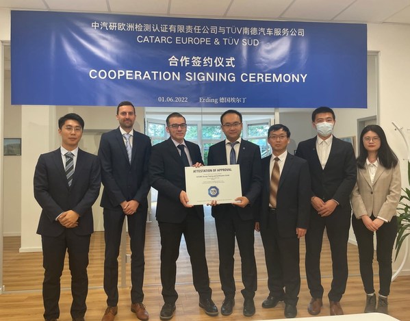 慕尼黑2022年6月28日 /新闻稿网 - Xinwengao.com/ — 近日,TUV南德意志集团(以下简称"TUV南德")授予中汽研欧洲检测认证有限责任公司(以下简称"CATARC Europe")汽车照明系统E-mark欧盟认证目击测试实验室资质。此次CATARC Europe通过TUV南德的审核,有力地证明了其在测试程序、技术设备、环境条件及实验室管理方面充分满足欧盟相关要求。同时也进一步深化了双方的合作,未来双方将充分利用各自品牌、专业技能、前瞻经验等优势资源,协力推动汽车产品高质量发展,为全球汽车行业转型升级贡献力量。TUV南德交通服务事业部首席技术官Alexander Kraus、中汽研汽车检验中心(天津)有限公司副总经理吕恒绪等领导通过线上及线下方式出席了本次授证仪式。
