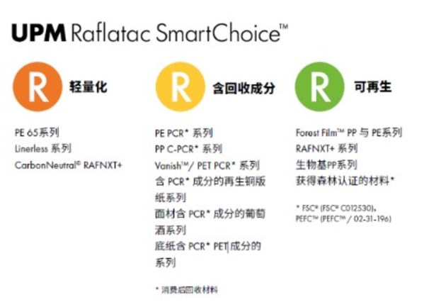 芬欧蓝泰标签推出的SmartChoice ™产品组合包括各种各样的可持续性包装材料,客户和品牌商可以通过选用轻量化、含回收成分、可再生资源的替代材料,减少对传统化石材料的使用,降低对环境的影响。