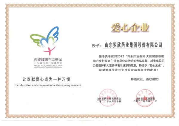 上海2022年6月30日 /新闻稿网 - Xinwengao.com/ — 6月30日,由山东省卫健委指导的2022“天使健康救助,助力乡村振兴”大型公益系列活动走进革命老区沂南活动在临沂市沂南县会议中心顺利召开。此次活动以“健康走基层,为民办实事”为主题,举办公益救助病种现场筛查、名老中医现场义诊,“天使之翼”沂南儿童健康促进工程暨儿科急危重症基层医生培训巡讲项目启动和培训基地揭牌,共建沂南“无结核病社区”,沂南青少年脊柱侧弯防治基地,“天使健康专项基金”爱心报名点落户沂南揭牌,捐赠爱心防疫物资等系列公益活动,旨在全面实施乡村振兴战略,用实际行动为人民提供全方位全周期健康服务。作为勇担社会责任的医药企业,罗欣药业始终与国家需要和人民健康同频共振,助力推动“健康中国”发展。此次公益活动,罗欣药业积极参与爱心防疫物资捐赠项目,向山东省扶贫开发基金会·天使健康专项基金捐赠总价值近15万元的儿童专用医药物资 — 盐酸氨溴索喷雾剂(商品名:罗润畅®),用于儿童患者治疗,守护儿童患者安全。