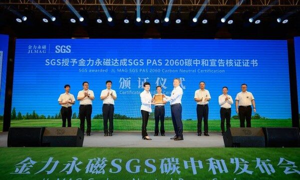 赣州2022年7月1日 /新闻稿网 - Xinwengao.com/ — 2022年6月30日,SGS为中国领先的高性能稀土永磁材料生产商江西金力永磁科技股份有限公司(以下简称:金力永磁,深交所股票代码:300748/港交所股票代号:6680)颁发稀土永磁行业全球首张SGS PAS 2060碳中和达成宣告核证证书。