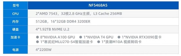 NF5468A5是浪潮推出的一款面向AI训练和AI推理、视频编解码等多种应用场景的全能型GPU服务器,在4U空间内搭载2颗AMD EPYC处理器,支持多达8张双宽加速卡。浪潮官网显示,这款产品已经支持NVIDIA、AMD、Intel、寒武纪、燧原等多家业界主流AI加速卡。