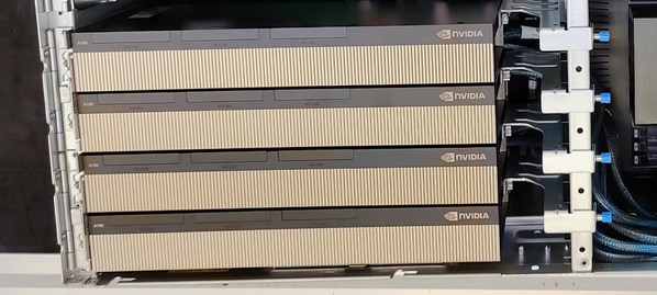 我们来重点看一下NF5468A5的GPU模组。样机搭配了8张NVIDIA A100 PCIE 40GB GPU加速卡,由于每张卡功耗高达250W,服务器也给GPU板卡配置了单独供电线,保证GPU卡的稳定工作。为了满足PCIE卡的高功率运行,我们看到NF5468A5在GPU板上专门设计了4个用于大电流通流的bus bar,据浪潮的工程师介绍,bus bar的通流能力可以达到2880W,这对于各类PCIE加速卡的支持是非常强劲的。
