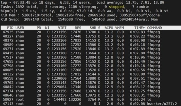 在FFMPEG视频框架下,我们直接用软件SDK中的demo脚本,测试了M10A在不同视频分辨率下的性能数据,如下是16路1080P全高清视频实时转码的性能测试情况: