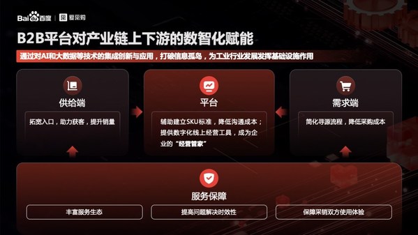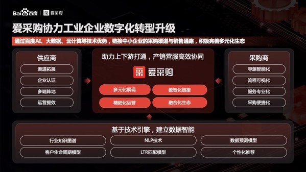 在供应商侧,爱采购帮助广大的上游企业拓展出了更为多样化的渠道,跨地域甚至国际化,并且实现了SKU数字化、沟通智能化、交易便捷化,缩短了原先冗长的流通环节,解决了信息不对称的痛点;在采购商侧,基于百度领先的AI数字解决方案以及搜索技术,实现了多环节、多行业、多品类的精准高效匹配。数智化平台能力的实现也离不开强大的技术引擎,基于行业知识图谱、客户生命周期模型和个性化推荐技术的升级,爱采购能够帮助上下游更精准连接、降本增效。