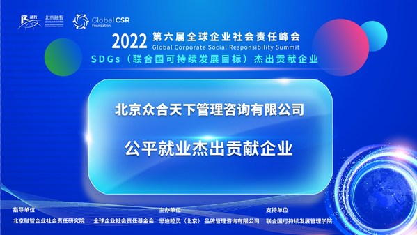 北京2022年7月19日 /新闻稿网 - Xinwengao.com/ — 7月15日,第六届全球企业社会责任峰会于线上圆满举行,本次峰会围绕联合国可持续发展目标,对国际碳减排、碳中和的合作、落实可持续发展目标,提升品牌国际影响力等议题进行深入探讨。峰会同期表彰"SDGs(联合国可持续发展目标)杰出贡献企业",众合云科凭借在公平就业领域的创新实践,被专家组委会评为"公平就业杰出贡献企业"。