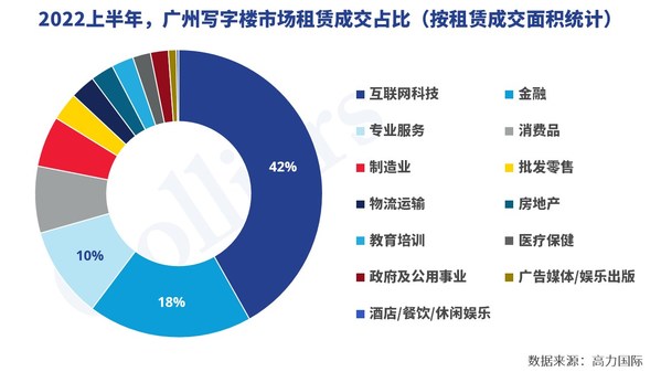 据高力国际对上半年全市甲乙级写字楼及产业园市场租赁成交统计,互联网科技、金融、专业服务行业占比达到7成,其中包含多个超1,000平方米的互联网科技类大宗租赁。对比去年下半年,因相关监管政策出台,叠加某个互联网科技的头部企业从核心商务区搬迁至非核心区域的自用总部大楼,今年上半年互联网科技头部企业的净吸纳量有所下降。