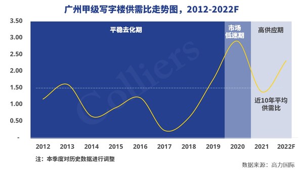 回看历史,2020年因疫情突发事件导致全市租赁需求明显放缓,在新增供应远低于近10年的平均水平的情况下,供需比仍呈现大幅上升态势,市场进入为期一年的低迷期。2021年,市场需求在压抑一年后出现报复性反弹,在超65万新增供应集中入市的情况下,供需比大幅回落至近10年的平均供需比水平。从2022上半年需求判断,高力国际预计2021年的报复性反弹现象不会延续至今年,今年去化量将大概率回归至疫情前水平。因此在新一轮的供应高峰影响下,供需比会在今年有所回升,空置率短期内上升的压力增大。