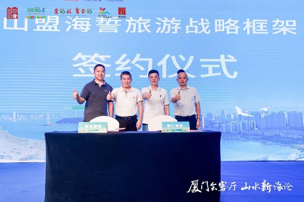 当天,推介会的第三个篇章"约海时光之旅",重点发布海沧区促进文旅产业发展的优惠政策,以宾馆、酒店、景区、旅行社等扶持奖励为主要内容进行现场推介,引商引才引客,实现真正意义上的文旅营销,与宾客相约海沧。在双方领导的见证下,厦门海沧国际旅行社有限公司与铜仁市青年旅行社有限公司签署了文化旅游战略合作框架协议,合力提振文旅消费市场。此外更有令人欣喜的抽奖环节,送出厦门文旅大礼包和旅游落地接待大奖,还精心安排了民俗博饼活动和趣味闽南语小课堂,提高参与度和积极性,让来宾感受气氛爆棚的闽南传统文化,领略厦门海沧独特的人文底蕴。