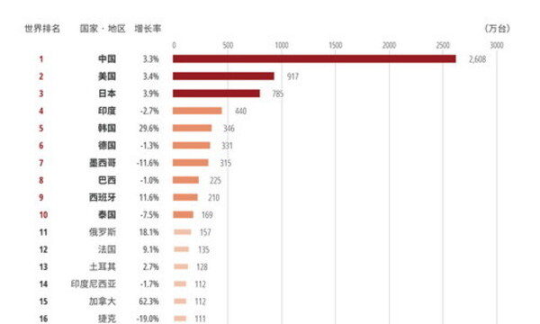 汽车产业是体现制造业综合实力的代表性产业,今天中国已经成为全球最大的汽车生产国,这是中国制造业发展水平的一个重要体现。从2021年各国家·地区汽车生产量排名来看,中国以压倒性优势遥领首位,生产量高达2,608万辆,约占全球汽车产量的32.5%,是排名第2位美国的3.1倍。中国汽车的生产量现在竟然比第2位~第5位的美国、日本、印度、韩国的总和还要多。