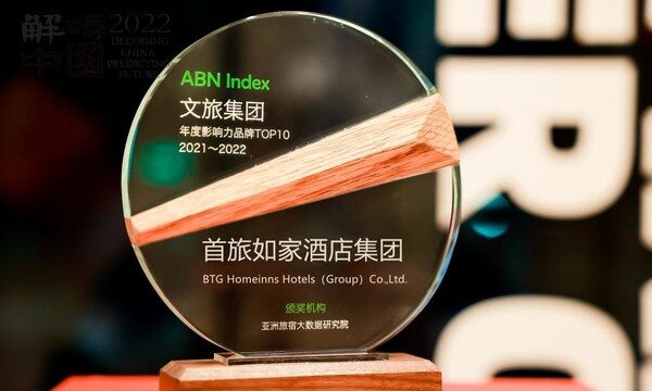 首旅如家酒店集团凭借领先全国的规模优势、强大的品牌影响力和可持续的会员价值,在近百位文旅领域专家、行业领袖的共同见证下荣获"ABN指数文旅集团2021-2022年度影响力品牌TOP10"称号。