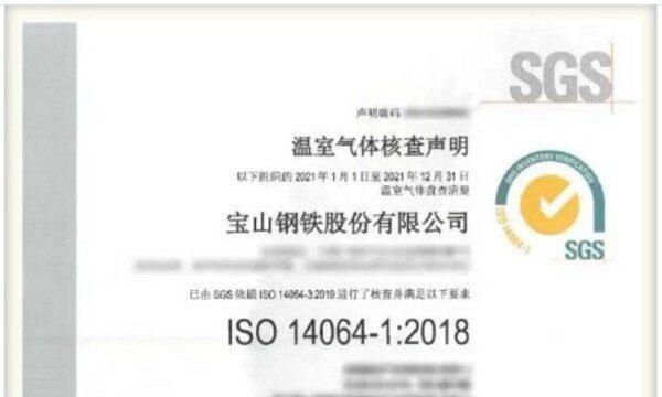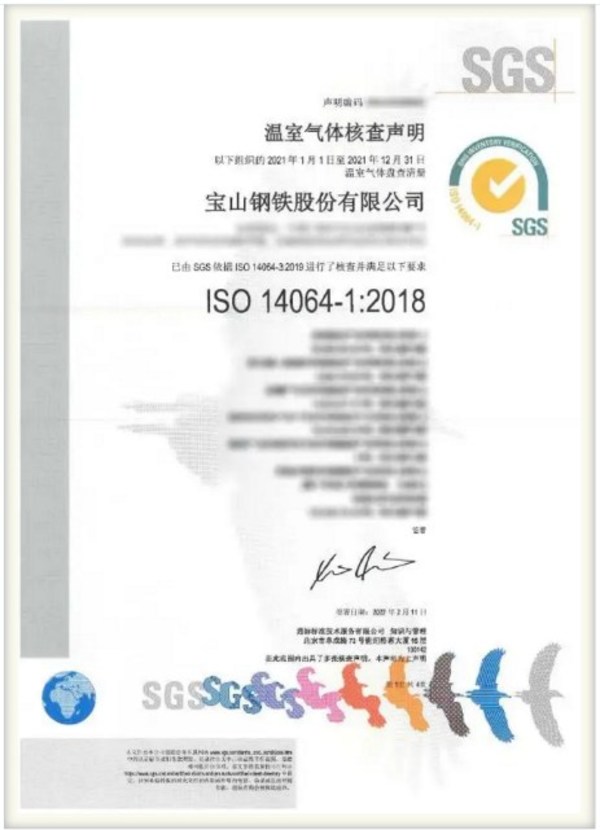 2021年宝钢股份与SGS建立碳合作伙伴关系,历时五个月,SGS为宝钢股份四大生产基地—上海宝山、武汉青山、湛江东山、南京梅山及几十家贸易和运输剪切轧钢配送公司完成了符合ISO 14064-1:2018标准的组织层级温室气体核查,该排放结果已披露于宝钢股份发布的《2021年气候行动报告》。