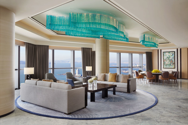 近270平的总统套房,一直是青岛瑞吉酒店的客房设计代表作之一。瑞吉品牌标志性装饰元素 — 水晶灯,在客房内与窗外的蓝天浪漫呼应,让面积开阔又不失精致设计的客房更添"云端"的优雅氛围。一周年活动之际,青岛瑞吉酒店将总统套房焕新打造为"云端瑜伽场"。