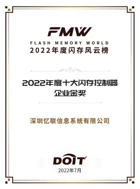 深圳2022年8月2日 /新闻稿网 - Xinwengao.com/ — 7月28,为期三天的2022全球闪存峰会(Flash Memory World)隆重召开。期间,2022年闪存风云榜榜单正式发布,旨在挖掘并集中展示闪存先进技术和实践应用,树立行业标杆典范。经资深编辑团队和专家评审组严格评选,忆联一举斩获"十大闪存控制器企业金奖"荣誉称号。