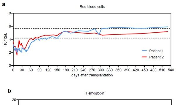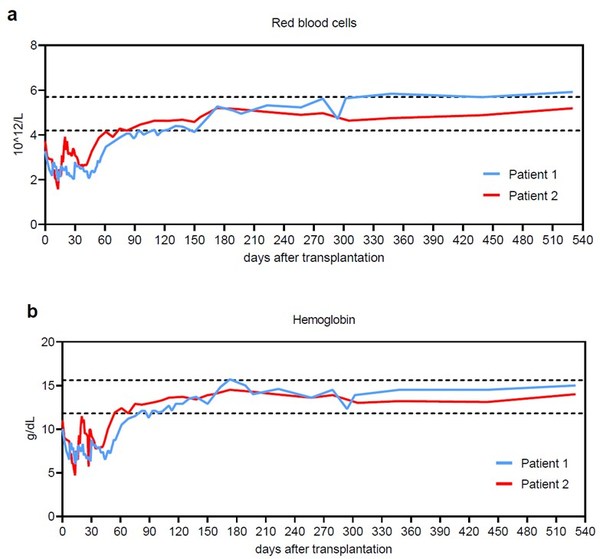 根据研究数据,基因疗法可达良好的治疗效果。通过基因编辑方式诱导γ-珠蛋白(胎儿血红蛋白HbF)的表达,是一种治疗由HBB基因突变引起的β地贫的极具前景的策略。邦耀生物科学家团队今日发表在Nature Medicine文章详细公布了该疗法的临床数据,并评估了基因疗法在输血依赖性β地中海贫血(TDT)儿童患者中的安全性和疗效。该试验将基因编辑的自体造血干祖细胞(HSPCs)移植到两名儿童患者体内,其中一名患儿(化名:希希),基因型为β0/β0(希希),被列为最严重的TDT类型;另外一例接受治疗的患儿(化名:望望)也属于TDT。截至文章投稿时,两名患儿的胎儿血红蛋白分别从基线时的2.55g/L、1.75g/L分别上升至最近一次访视的149g/L和139g/L,总血红蛋白含量也分别达到了152g/L和140g/L,且在治疗后都实现了脱离输血依赖超过16个月(脱离输血依赖的定义为:未输血的情况下总血红蛋白达到或超过90g/L)。在整个治疗过程中,清髓预处理相关毒性较轻,未发生严重的感染,并分别于移植后52 天和40 天出院。如下图,两名患者的红细胞数量和总体血红蛋白水平在第 45 天左右开始稳定增加,在第 75 天左右达到健康水平。截至日前,两例受试者脱离输血依赖均已超过24个月。