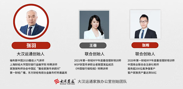 大汉运通创始团队及合作讲师,集聚来自全国的顶级金融、科技、法律、税务等专家,多位曾任职于世界500强金融企业,均为前高管及资深人士。公司创始人张羽是福布斯中国2019最佳人气讲师,联合创始人王蓓、张晖分别荣获2021及2020年第一财经RFP年度最佳理财培训师。