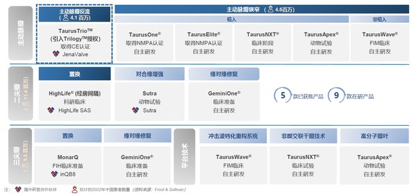 集团通过外部收购及内部研发建立了强大的产品管线,拥有全面覆盖主要瓣膜疾病和下一代技术的广泛的创新在研产品。截至2022年8月19日,集团共有四个商业发展(BD)项目,分别布局在治疗主动脉瓣反流的主动脉瓣置换、二尖瓣置换、三尖瓣置换及二尖瓣对合缘增强领域。除了BD项目,集团的内部研发项目也获得业界广泛认可,研究方向包括人工瓣膜耐久性的提高、非植入性的瓣膜疾病治疗方案以及开发创新的二尖瓣修复产品。