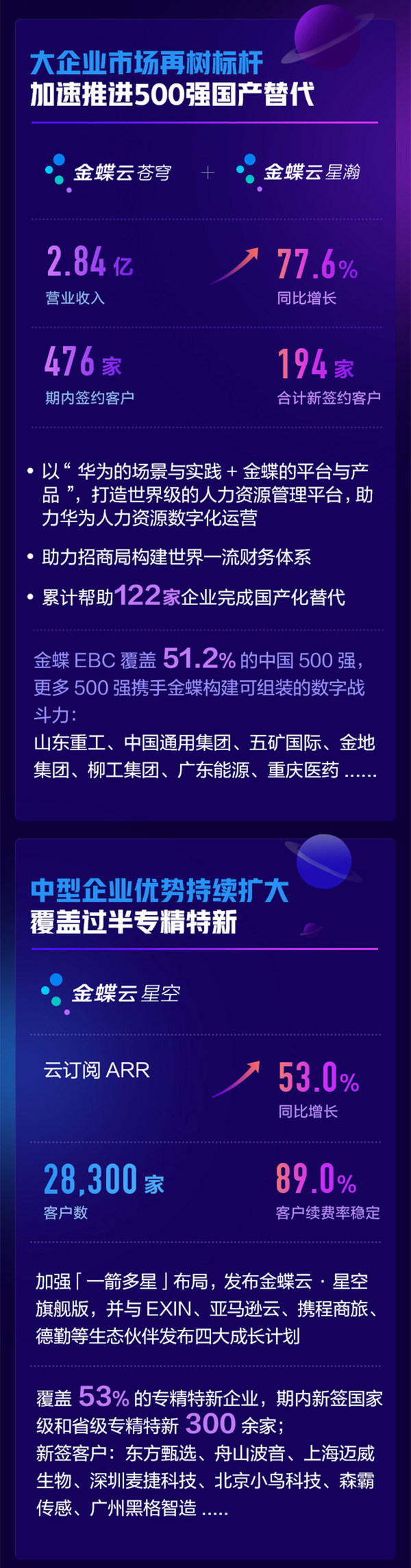 报告期内,金蝶云·苍穹和金蝶云·星瀚合计录得收入约人民币2.84亿元,同比增长77.6%,续费率较去年同比保持稳定;期内签约客户476家,新签客户194家,包括山东重工、中国通用集团、五矿国际、金地集团、柳工集团、广东能源、重庆医药等超大型和大型企业。此外,公司继续引入战略级交付伙伴,实现交付直签突破,支撑公司全面进攻大企业市场战略。过去两年,苍穹和星瀚已经累计帮助122家企业完成国产化替代,助力华为、万科、招商局、物产中大、河钢集团、沙钢集团等众多世界500强进行数字化管理重构。