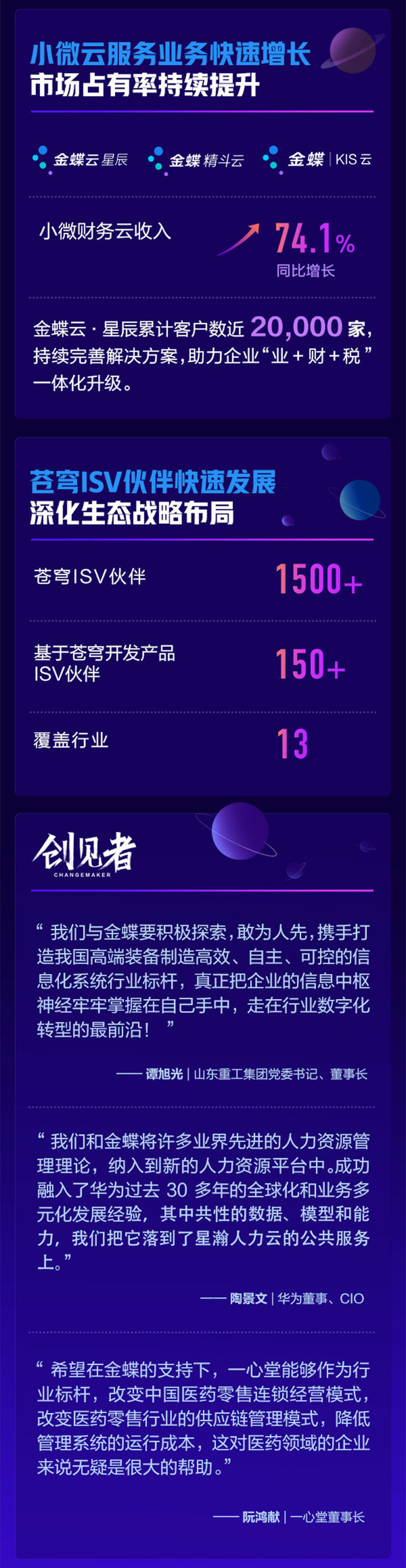 报告期内,小微企业财务云服务业务继续保持快速增长,收入同比增长74.1%,其中金蝶云·星辰收入同比增长337.7%,续费率72%,客户数近20,000家。金蝶云·星辰定位满足成长期的小型商贸及工贸企业,持续完善解决方案,助力企业"管理+经营"一体化升级,帮助企业实现财税管理智能化、客户经营数智化、线上线下一体化和产供销协同一体化,重新定义了业财税一体化升级的标准。通过产品的不断创新与营销推广,小微企业生态伙伴布局日益完善,金蝶在小微企业市场的占有率进一步提升。