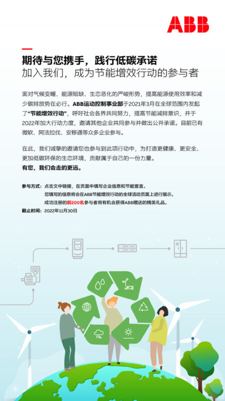 北京2022年8月26日 /新闻稿网 - Xinwengao.com/ — ABB运动控制“节能增效行动”再次推出新举措,诚挚地邀请大众参与,与ABB运动控制一起,共同推动节能减排,助力打造低碳环保的生态环境,并做出公开承诺。 点击文末链接即可加入,成功注册的前200名参与者将有机会获得ABB赠送的精美礼品。 活动参与详情 参与方式: 点击文末链接,在页面中填写企业信息和节能宣言。 参与条件: 在中国境内合法登记注册的企业都可通过上述方式参与。 奖品: 成功注册的前200名参与者将获得PHILIPS镜面移动电源(型号:DLP2116B)一个,获奖名单根据注册时间先后顺序排列,先到先得,同一企业只能注册一次,如有来自同一企业的多人注册,获奖名额归该企业第一个成功注册的参与者。参与者填写的信息将会按照我国个人信息保护法及数据保护相关法规的要求在ABB节能增效行动的全球活动页面上进行展示。 活动截止时间: 2022年11月30日 开奖时间与奖品寄送方式: 中奖名单将于2022年12月15日在“ABB传动”微信公众号公布,届时如需弃奖的参与者请在12月20日前联系主办方。奖品将于2022年12月21日至2022年12月31日期间通过快递的方式陆续寄出。(届时如因疫情管控无法寄送快递,将会在恢复快递后寄出奖品。) 主办方: 北京ABB电气传动系统有限公司 联系地址: 北京市朝阳区酒仙桥北路甲10号401楼 活动参与链接: https://app.ma.scrmtech.com/svip/IndexCustomerForm/CustomerIndex?pf_uid=26331_2031&is_follow=yes&pf_type=3&id=9304 与此同时,您也可通过点击节能增效行动网站 https://www.energyefficiencymovement.com/cn/,获取更多关于节能增效的技能与最新资讯,或通过关注“ABB传动”微信公众号,点击公众号菜单栏中“关于我们”的“节能增效”,访问节能增效行动网站。 行动起来,与ABB一起做节能增效的参与者,共建低碳社会。