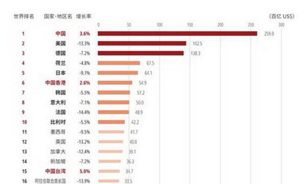 如图1所示,在2020年全球主要国家•地区出口额排名中,中国以绝对性的优势位居榜首。排名前10位的国家•地区依次为中国、美国、德国、荷兰、日本、中国香港、韩国、意大利、法国和比利时。其中,只有中国和中国香港地区的出口实现了增长。