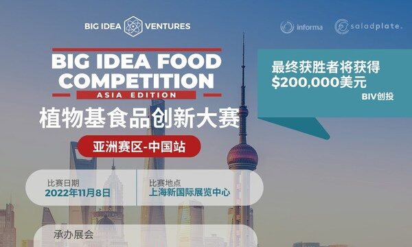 上海2022年8月31日 /新闻稿网 - Xinwengao.com/ — 2022植物基创新食品大赛(亚洲区)是由新食品领域的风险投资基金Big Idea Ventures(BIV)创立,旨在寻找亚洲区域优秀植物性食品生产初创企业。此次赛事将在中国、韩国、印度尼西亚、新加坡、泰国和日本轮流举办,每个赛区将决出一位优胜者参加新加坡的世界总决赛,并角逐20万美元的大奖。首届植物基食品创新大赛(中国站)将由Big Idea Ventures与中国食品土畜进出口商会中国植物基食品应用推广联盟、上海博华国际展览有限公司共同主办。
