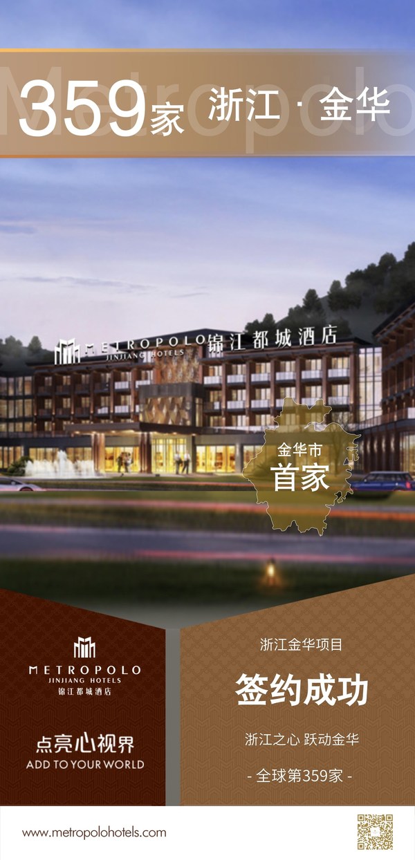 金华2022年8月31日 /新闻稿网 - Xinwengao.com/ — 近日,锦江酒店(中国区)旗下定位国际四星级的文旅探索型中高端酒店品牌 — 锦江都城酒店再签新店。本次新签约的项目位于浙江省金华市,作为锦江酒店(中国区)旗下唯一带有"锦江"字样的中高端酒店品牌,近年来发展迅猛,深受投资人青睐。截止目前,锦江都城酒店强势签约,开业和筹建已达359个项目,遍布中国120多个城市,展现了强大的投资市场虹吸能力。