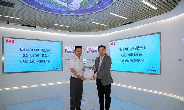 上海2022年9月2日 /新闻稿网 - Xinwengao.com/ — 近日,全球机器人市场的领导者和先行者上海ABB工程有限公司的机器人打磨工作站获TUV北德颁发的欧盟CE认证证书,颁证仪式在位于上海的TUV北德中国区运营中心顺利举行。TUV北德亚太区CEO兼大中华区董事长任骏、ABB全球电子电气运营总监孙伟及双方企业代表出席了此次颁证仪式。获此证书,标志着ABB工程有限公司的机器人打磨工作站在产品技术要求方面已达到欧盟标准,将有助于其机器人打磨工作站产品在欧盟国家和认可欧盟CE认证等全球市场的业务推广。