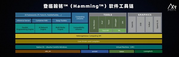 此次大会,登临发布了完整的翰铭(Hamming)软件工具链,该工具链支持国内外主流AI框架、操作系统、CPU、容器与虚拟机、及推理服务器,可帮助客户尽快把算法部署到实际业务上,并帮助云端与数据中心的客户更好地利用硬件资源。