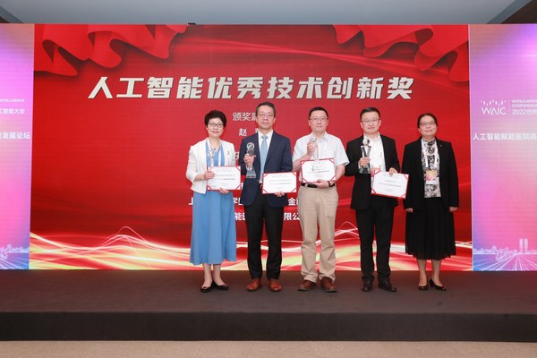 人工智能优秀技术创新奖获奖单位及颁奖者:复旦大学附属中山医院副院长顾建英、上海市肺科医院党委书记陈昶、上海交通大学医学院附属瑞金医院副院长胡伟国、上海联影智能医疗科技有限公司联席CEO周翔、上海申康医院发展中心副主任赵蓉(从左至右)
