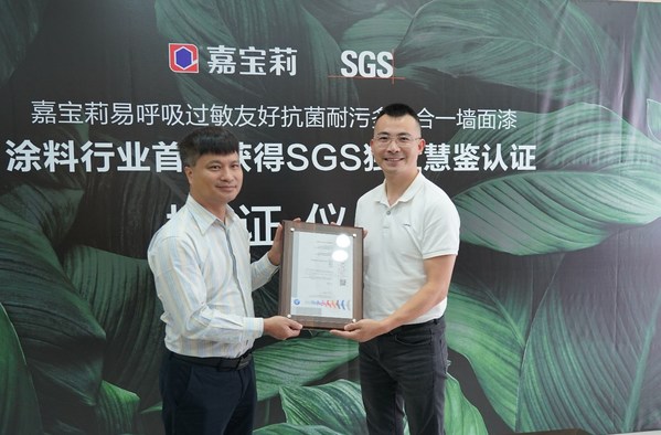 广州2022年9月14日 /新闻稿网 - Xinwengao.com/ — 9月9日,国际公认的测试、检验和认证机构SGS为广东嘉宝莉科技材料有限公司(以下简称:“嘉宝莉”) 颁发独立慧鉴认证证书。嘉宝莉易呼吸抗敏友好抗菌耐污多效合一墙面漆产品,获“刷涂72小时后无气味内墙涂料”、“I级抗菌I级防霉内墙涂料”、“低VOC和甲醛释放量内墙涂料”认证。此认证为SGS在中国发出的涂料行业首张独立慧鉴认证。