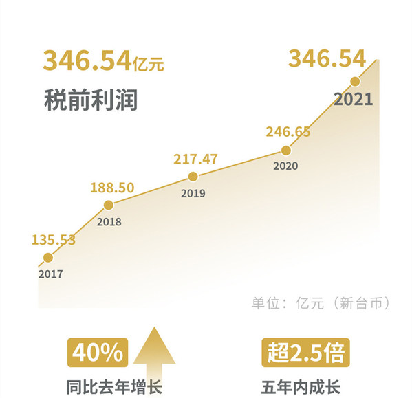 2021全年中租控股合并税前利润为新台币346.54亿元,同比去年增长40%,与2017年的合并税前利润新台币135.53亿元相较,成长超过2.5倍。2021年中租控股合并税后利润(归属母公司)为新台币216.44亿元,较2020年成长28%。每股税后利润(EPS)为新台币14.8元。