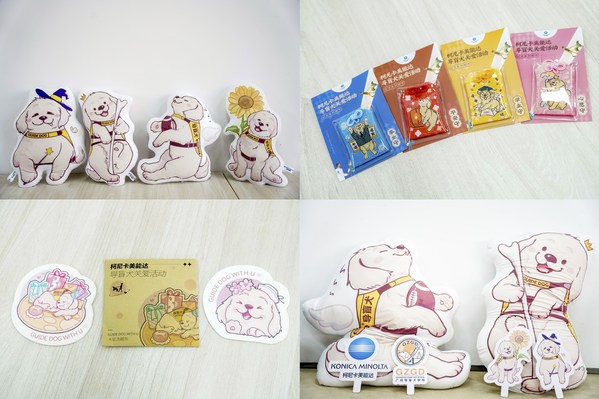此次活动的另一亮点是由柯尼卡美能达设计、制作的导盲犬纪念周边。杜渐女士认为,践行公益不仅仅是物资层面的支持,也需增进大众对导盲犬的认知,从而对其和视障人士多一些包容和支持。因此,秉持"Giving Shape to Ideas创意改变世界"的品牌主张,柯尼卡美能达设计并制作了御守、木浆洗碗布、抱枕等纪念周边,以柔性的方式讲述导盲犬的故事,植入记忆锚点,吸引更多人加入公益行动。这些纪念品后续将提供给广州导盲犬学校进行义卖筹款,同时也将赠予关注、支持导盲犬公益事业的集团员工与社会爱心人士。