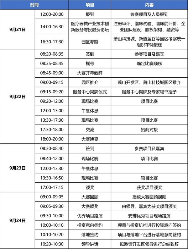 中国(浙江)自由贸易试验区-萧山赛区 苏州2022年9月23日 /新闻稿网 - Xinwengao.com/ — 由医疗器械创新网主办的中国医疗器械创新创业大赛("科创中国"系列活动)在科技部、中国科协指导下,自2018年起已连续成功举办了四届,征集到来自海内外在研医疗器械创新项目2000余项,大赛及配套论坛共吸引约2000余家企业以及创新服务与投资机构参与,现场已达4万人次观摩,并邀请多位部委领导、院士及百余位来自监管和产业的权威专家现场指导,累积评出一二三等奖项目共计253个,每届赛后半年跟踪统计共融资逾52亿元,部分项目后续还获得部委、省市和军队的课题资助及其他各种赛事奖项。大赛有力地助推了医疗器械的成果转化,受到了各方一致好评。第五届大赛自2022年3月启动报名以来征集项目733个,目前正在全国各地举办类别赛、专场赛。 为推动中国医疗器械产业持续创新发展、深化医疗器械产业产学研用资监各环节合作、激发企业和临床医护人员的创新活力,推动杭州萧山医疗器械产业创新发展,"科创中国丨第五届(2022)中国医疗器械创新创业大赛中国(浙江)自由贸易试验区-萧山赛区"将在9月21-24日在杭州萧山隆重举行。 此外,大赛一、二、三等奖落地萧山项目,分别对应按照萧山区"5213"计划中卓越类、领航类、新锐类标准给予项目及人才落地支持,最高达一千万元。 欢迎各企业、科研院所、投融资机构、创新服务机构等相关单位和有识之士莅临共同探讨医械领域技术创新。 一、时间地点 时间:2022年9月21日-24日 地点:浙江萧山水博园大酒店宝盛厅 二、组织机构 主办单位: 萧山区人民政府 萧山经济技术开发区管委会 医疗器械产业技术创新战略联盟 医疗器械创新网 承办单位: 萧山区委人才办 萧山区科学技术局 萧山区投资促进局 萧山科技城管理局 自贸试验区萧山管理办公室 协办单位: 中国医疗器械行业协会创新服务专业委员会 新道蓝谷生物医药产业园 三、日程安排 日程安排 四、参赛项目列表 第五届中国医疗器械创新创业大赛微创器械与植介入产品决赛(22-23日) 第五届中国医疗器械创新创业大赛微创器械与植介入产品决赛路演项目名单(22-23日) 第五届中国医疗器械创新创业大赛可穿戴与远程医疗产品决赛路演项目名单(22日) 第五届中国医疗器械创新创业大赛产业转化专场赛路演项目名单(23日) 具体路演名单请点击:https://mp.weixin.qq.com/s/KyS1mnVtxlakSoFDVk_Bew 欢迎各企业、科研院所、投融资机构、创新服务机构等相关单位和有识之士一同探索精彩赛事。 萧山科技城介绍: 萧山科技城位于杭州市东侧,萧山区北翼,规划总用地面积约50.76平方公里,是萧山区深度融杭主引擎、杭州"拥江发展"主战场。萧山科技城地理位置优越,交通条件成熟,轨道交通、高架、高速路网立体覆盖,靠近"浙江省门第一站"萧山国际机场、杭州东站、杭州南站,是杭州市萧山区东西联动、南北横贯最重要的节点。 萧山科技城聚焦重点,精准发力,全力布局"医疗器械产业链"和"生物技术创新链"两大发展路线,重点聚焦微创及植介入高值耗材、数字医药、体外诊断等细分领域,充分发挥"BT+IT"的产业优势,构建"2+2+X"的产业链新体系。根据"孵化-加速-产业基地-总部"一条龙精准培育模式,萧山科技城将五年内精准打造超200万方的"1+3+X"专业空间。同时,萧山科技城成立了10亿元规模的产业发展基金,目前成功投资并落地了数个产业项目,为企业落地生根、加快产业化进程保驾护航。萧山科技城范围内拥有浙江大学国际科创中心、西安电子科技大学杭州研究院两大高校平台,为区域医疗器械产业提供强力人才资源支持的同时,与企业深度融合,实现互相赋能。萧山科技城正朝着科技创新策源地、产城融合新窗口的目标不断奋进。 新道蓝谷介绍: 新道蓝谷是杭州市萧山区内全新建设的专业生物医药产业园区,园区位于萧山科技城核心区域,紧邻杭州机场轨道快线知行路站。新道蓝谷总占地面积150亩,总建筑面积24万余平,提供包括GMP生产空间、研发试验空间、公共实验空间、共享孵化空间等在内立体载体空间。园区厂房设计覆盖从1000平到7500平不等的面积段,配置4.5米-6米-8米不同层高、1000kg/平载荷、蒸汽燃气接入、独立排污管道,全面满足医疗器械产业化专业需求。同时,园区服务团队,联合专业产业机构,可为入驻医疗器械产业项目提供包括补贴申报、政策咨询、人才落户、CRO服务在内的全方位产业服务。 智联国际生命科学科创中心 智联国际生命科学科创中心是萧山区政府与传化集团重点打造、国资主导的生物医药产业园,位于杭州萧山科技城核心启动区,毗邻钱江世纪城及临空经济示范区。一期占地177亩,建筑面积约33.4万平方米,2022年底起分批竣备交付。 基于国家级孵化器多年运营经验,应域内多家生命健康独角兽、准独角兽企业需求,生命科学科创中心重点打造生物技术与医疗器械两大核心产业链布局,并配置GMP空间、独栋研发楼、高层办公研发楼,以满足企业从研发至产业化的空间发展与生态互融需求。 为更好服务科学家及科创企业发展,传化科技城设立超100亿的生命科学产业全生周期产业基金群,深化"基础运营+专业配套"立体式运营服务体系,建成高标准教育、医疗、商业等城市配套,为科学家及科创人才打造有温度的国际社区。