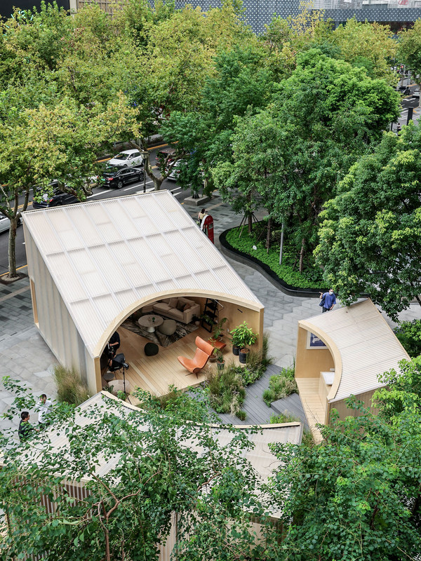 在"间园"中,三个独立空间高出中心公园一些,面对公园的一面完全打开,家具内收,入口则自然形成缘侧地带。在公园与室内所对应的"公共-私密"秩序中,缘侧作为过渡,既可作为步入室内的缓冲,也可席地而坐,拥抱绿意。