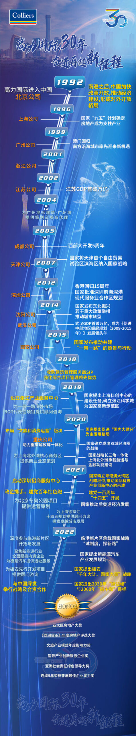 自1992年正式进入中国以来,高力国际30年来一路发展高歌猛进。"前瞻性布局、专业化能力、国际化视野"既是高力国际发展内动力,也助力我们推动行业发展,通过把握每一次重要机遇,最终成就自身发展。