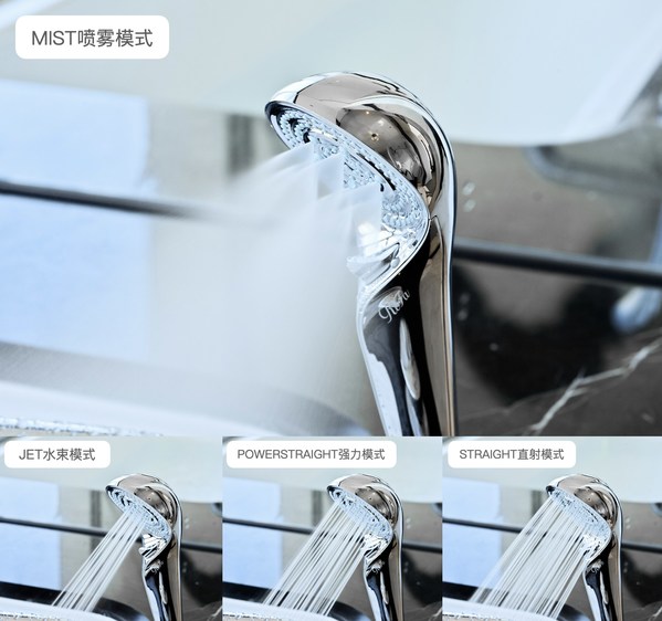 具有"小气泡美肤花洒"之称的ReFa FINE BUBBLE S 黎珐焕盈微细气泡多模式花洒拥有四种自如切换的水流模式:JET水束模式、POWERSTRAIGHT强力模式、STRAIGHT直射模式、MIST喷雾模式,针对不同沐浴和美容健康的需求。其中,MIST喷雾模式具有卸除残留彩妆功能,通过其丰富的微细气泡,可柔和洗净脸上的彩妆,呵护娇嫩肌肤。