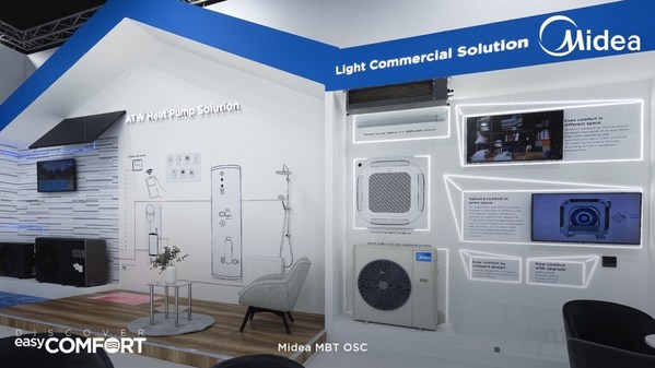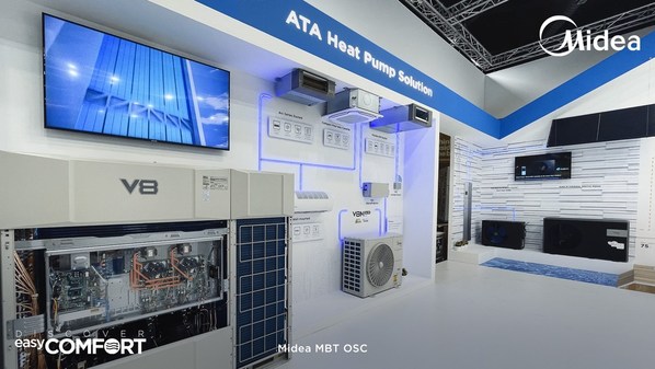 本次美的楼宇科技协同美的家用空调事业部(RAC)及美的德国分公司(Midea Europe GmbH)共同参展。为响应当地市场对热泵产品的需求,美的带来了ATW solution及ATA solution两大热泵解决方案。ATW solution集合了M thermal Split、M thermal Mono,商用热泵以及Pool Heat Pump三款产品,着重展示了R290 Mono以及商用热泵;ATA solution则包括了V8顶出风及R32 Mini VRF。美的集合加热与冷却、地暖、生活热水为一体的系统,同时采用R32、R290环保冷媒,提供了整体化的解决方案。