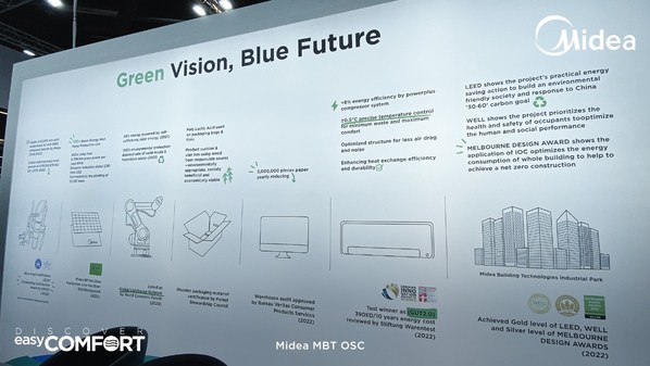 在本次展会上,还展示了目前已获得SGS认证的热泵零碳产线以及斩获墨尔本设计奖银奖,LEED和WELL的双金认证的美的工业园项目。