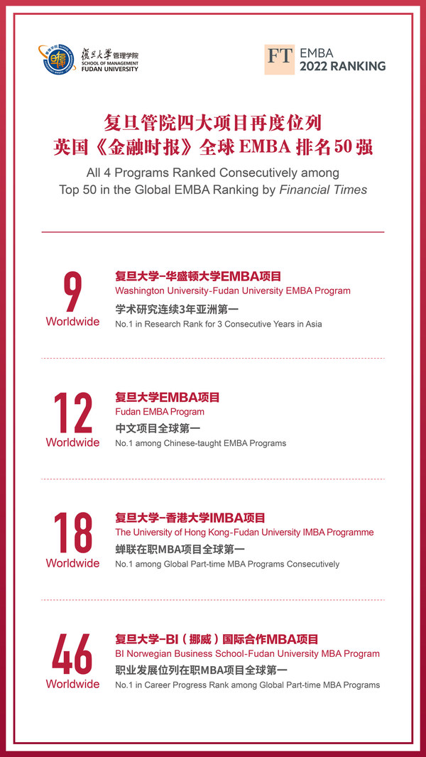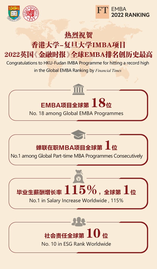 上海2022年10月18日 /新闻稿网 - Xinwengao.com/ — 近日,英国《金融时报》(Financial Times, 以下简称FT)发布了2022全球EMBA项目排名。香港大学-复旦大学IMBA项目在排名中再创佳绩,以全球EMBA排名第18位的综合表现创历史之最,蝉联在职MBA项目全球第一、毕业生薪酬增长率斩获全球第一。
