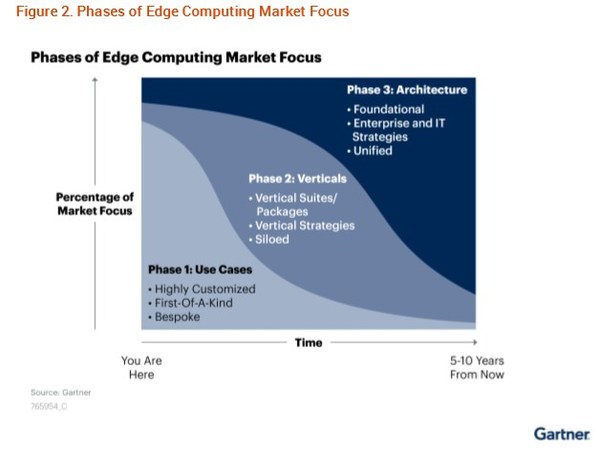 同时市场指南将市场划分为三个阶段,第一阶段边缘计算市场需求仅仅是企业数字化转型的一部分,例如,制造业中的工业4.0,或未来的零售商店,用户需求呈现出高度定制化,第二阶段,随着行业需求的深入,边缘计算的需求会不断扩展,形成面向特定垂直行业的一整套整体解决方案,第三阶段边缘计算的许多技术需求将跨越垂直领域,比如企业用户需求会从店面智慧零售扩展到工厂AI质检场景和智慧油井的一些工作场景中,需要供应商具备横向扩展的能力。针对供应商将面临的需要横跨不同垂直行业,扩展性困难的挑战,Gartner也指出,目前一些有远见的企业已经在专注于定义边缘计算策略和架构,随着其相关标准和生态合作的建立,将推动市场不断成熟。