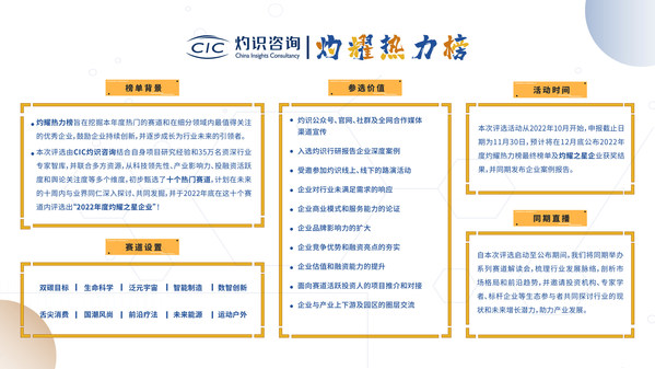 上海2022年10月24日 /新闻稿网 - Xinwengao.com/ — 2022年,国家颁布了一系列产业支持和利好政策,科创板助力“专精特新”持续释放动能与活力。一批崭新面貌的创新企业正在新的市场秩序下涌现,有推进自主研发的高端装备制造、半导体等高精尖产业,有概念先行充满科幻想象力的元宇宙、Web3.0,有后疫情时代广受关注的生命科学、前沿疗法等健康产业,也有热点爆款频出的新消费赛道。市场新一轮的百花齐放逐渐显现。值此背景下,为进一步促进热门细分赛道的创新企业、投资机构、产业链上下游等生态伙伴的互联互通,打通信息壁垒和资源屏障,并实现高效协作联接,CIC灼识咨询隆重推出"2022年度灼耀热力榜"评选活动。
