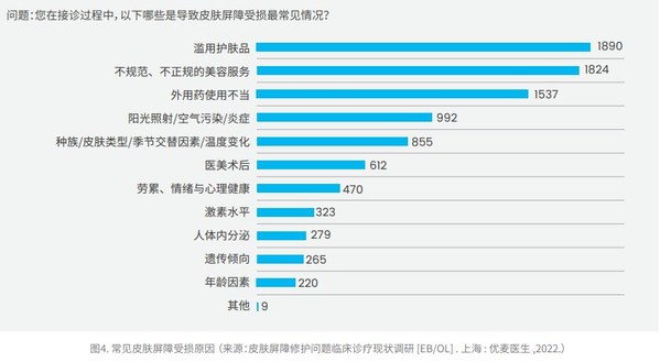 通过对全国两千多位皮肤领域专业人士的问卷调查发现:皮肤屏障受损患者对功效性护肤品有着巨大的需求。但日常生活中,患者普遍对功效性护肤品的科学选择及正确使用方法缺乏认知,"滥用护肤品"被认为是引起皮肤屏障受损的主要因素之一。